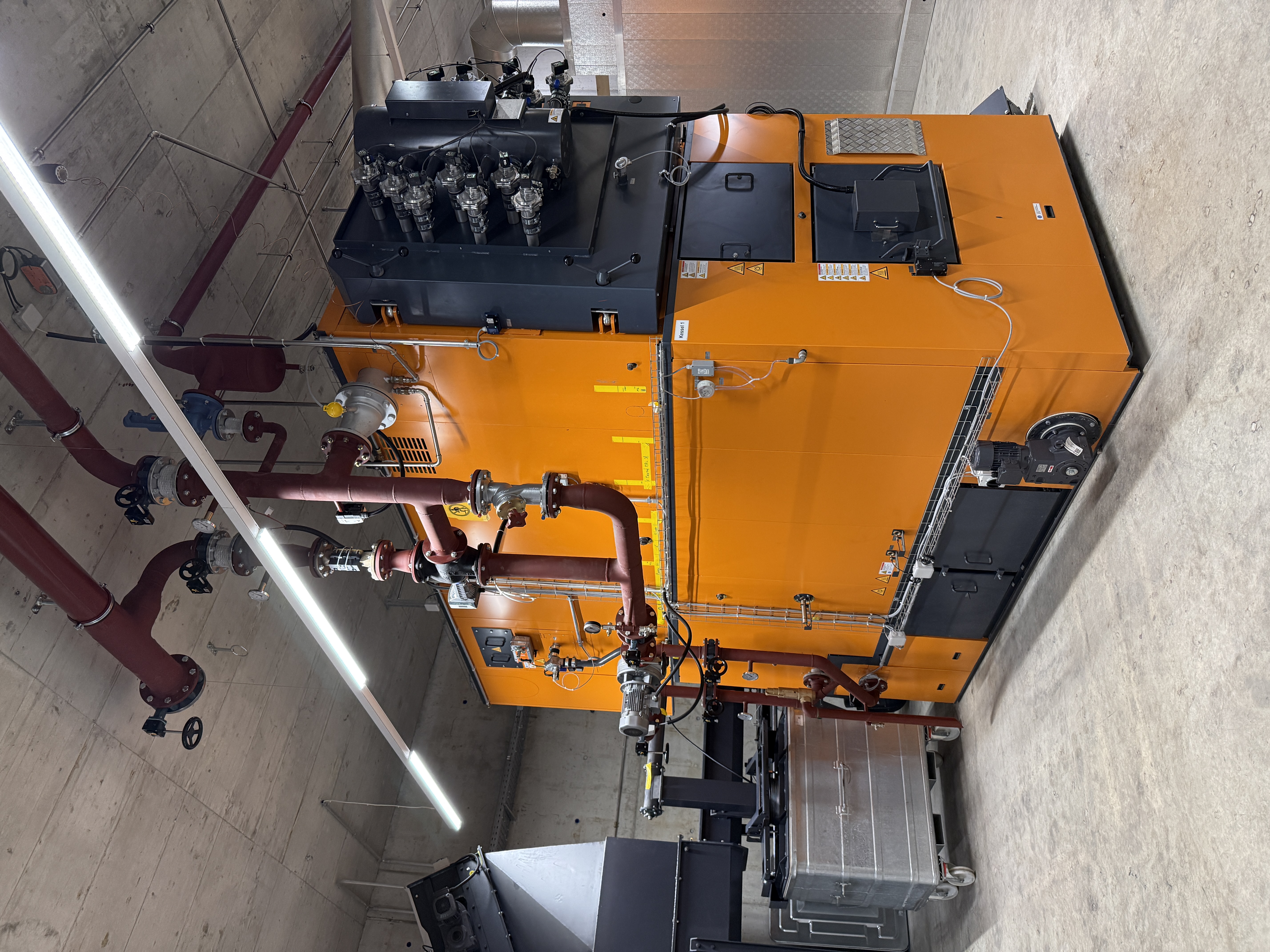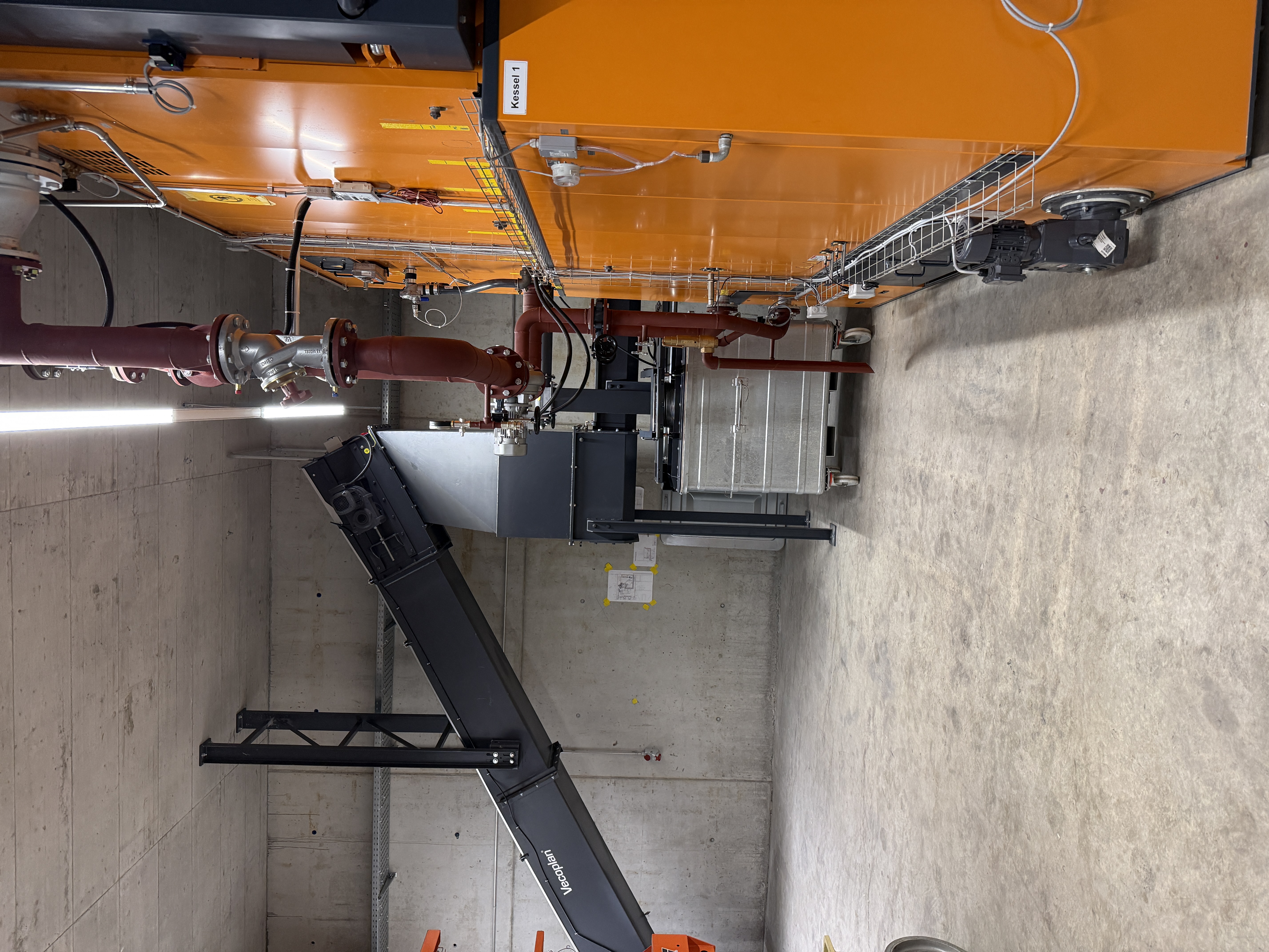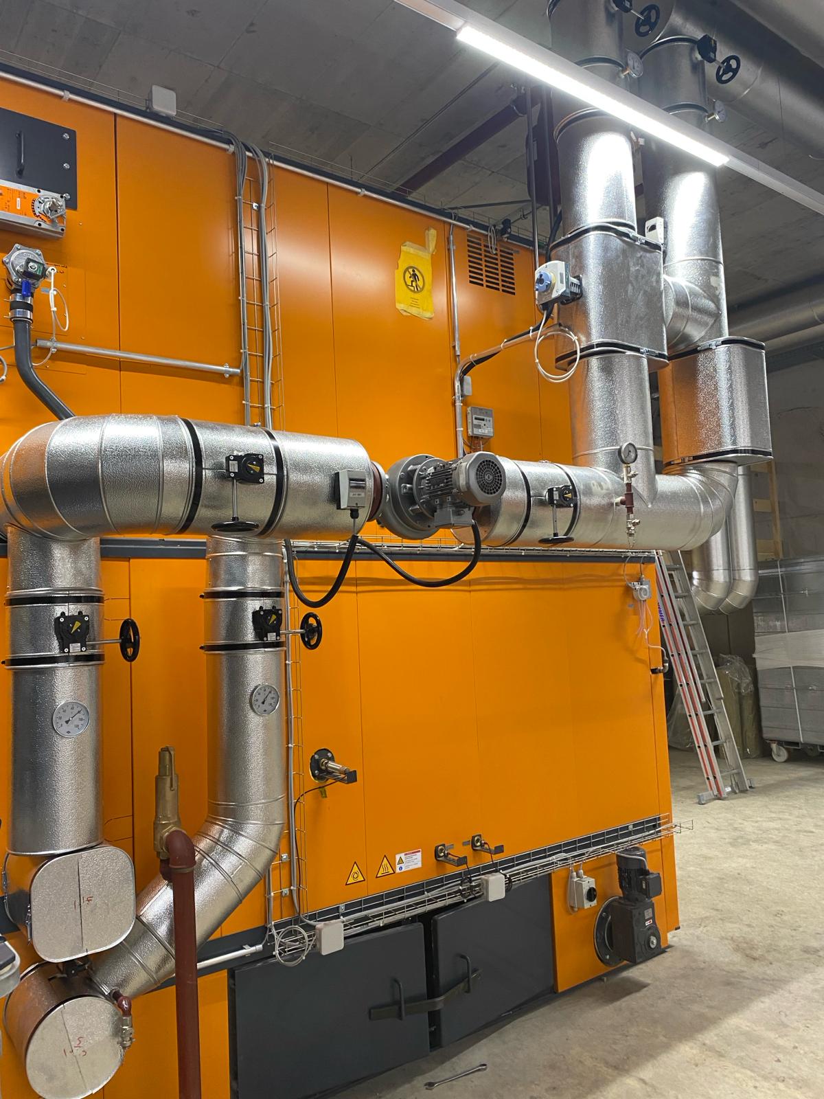 Installation und Anschluss Holz-Heizkessel für Fernwärme.